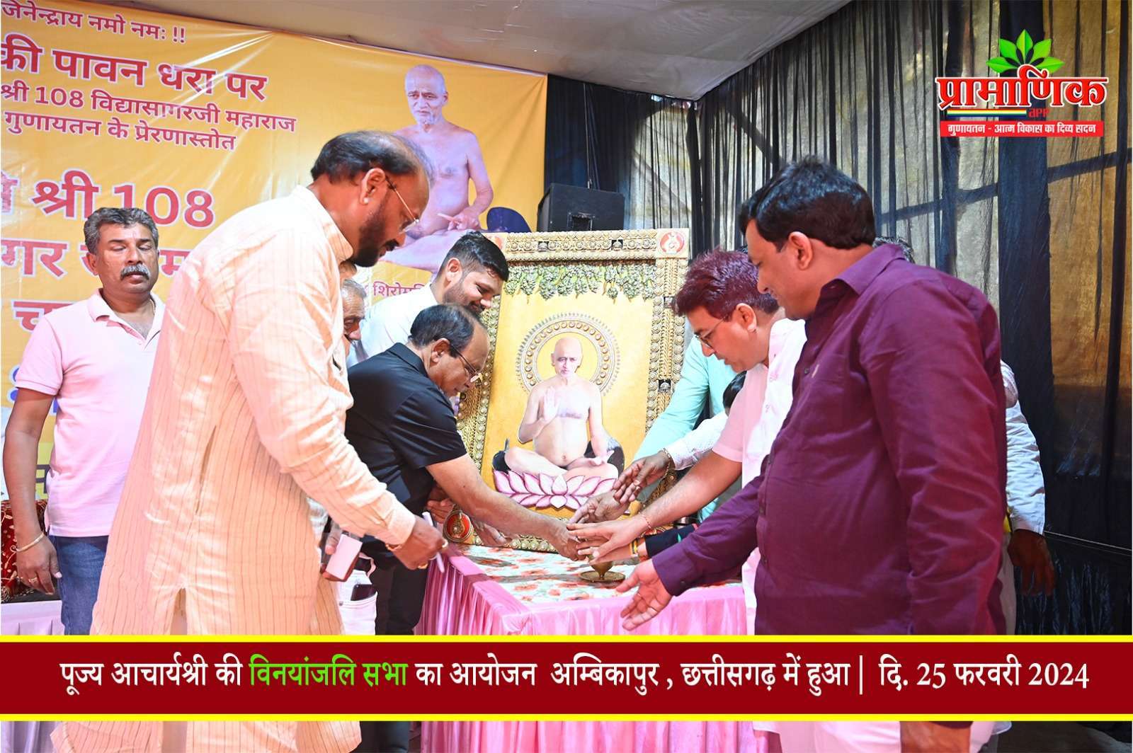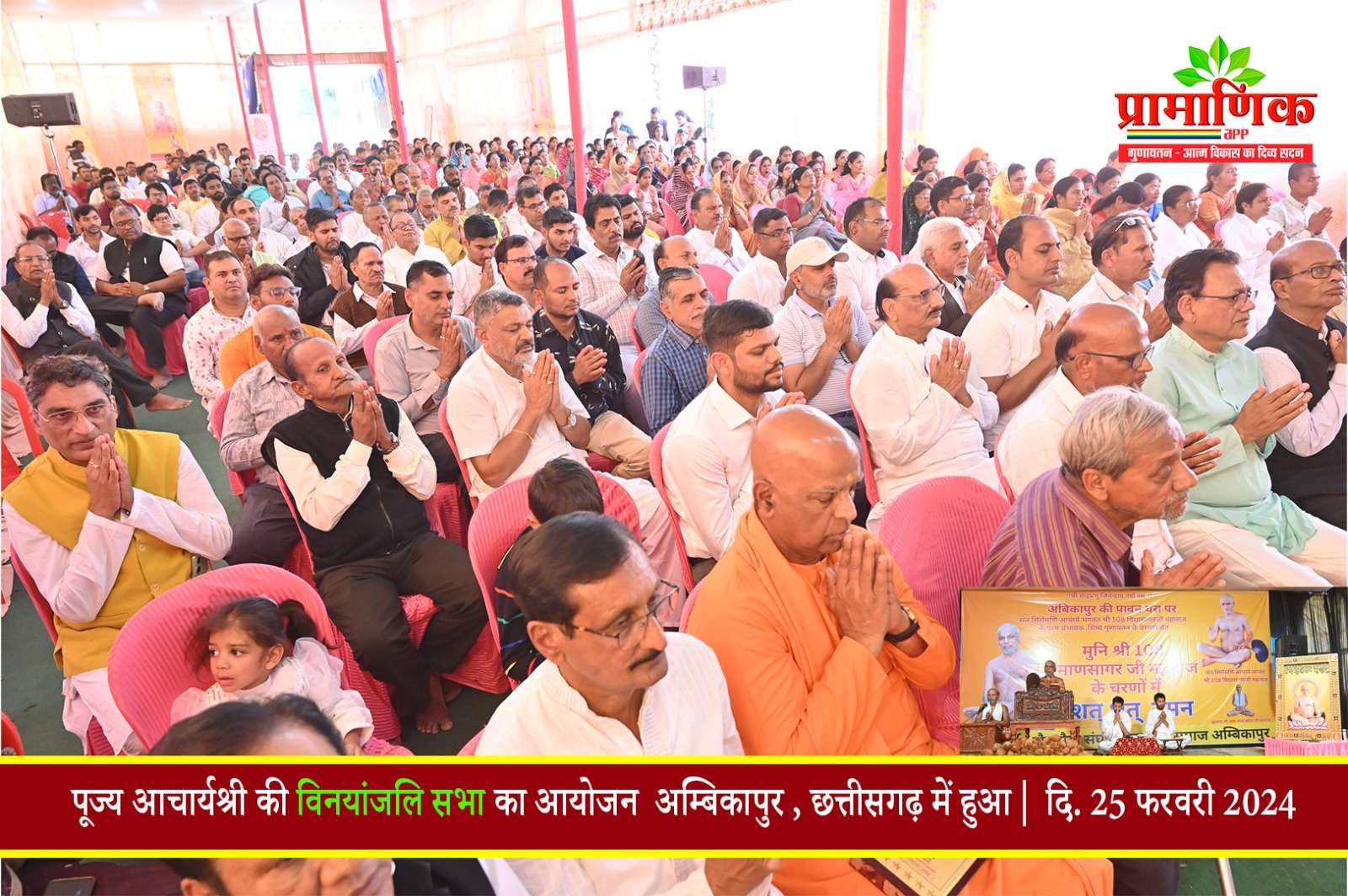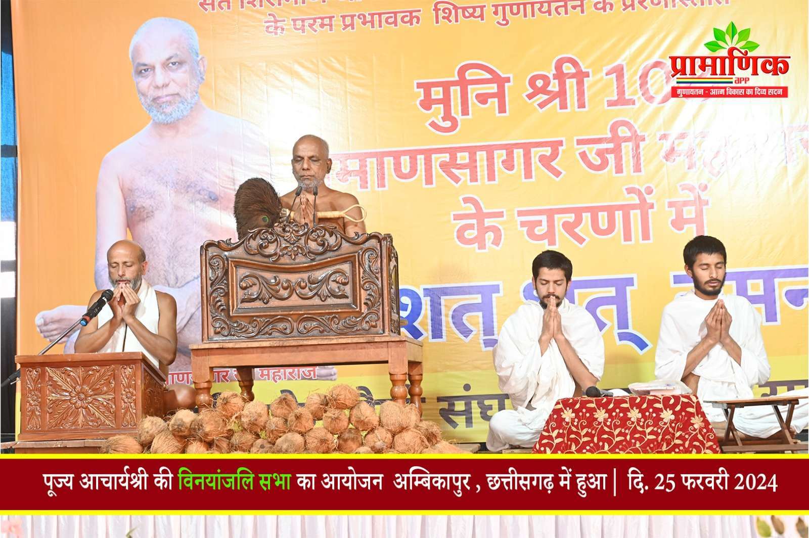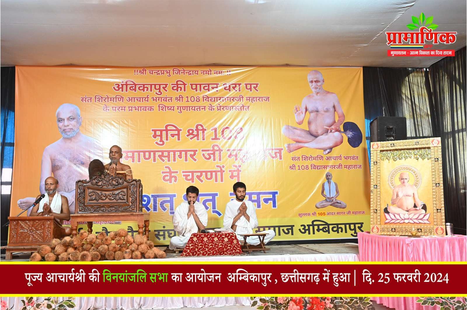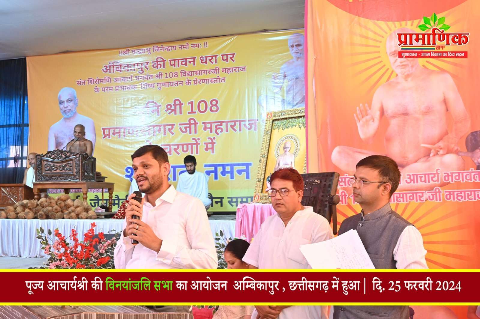 परम प्रभावक शिष्य प्रखर वक्ता,गुणायतन प्रणेता, भावना योग प्रवर्तक, शंका समाधान के जनक परम पूज्य मुनिश्री 108 प्रमाणसागर जी महाराज ससंघ✴ के सानिध्य में पूज्य आचार्यश्री की विनयांजलि सभा का आयोजन अम्बिकापुर , छत्तीसगढ़ में हुआ.