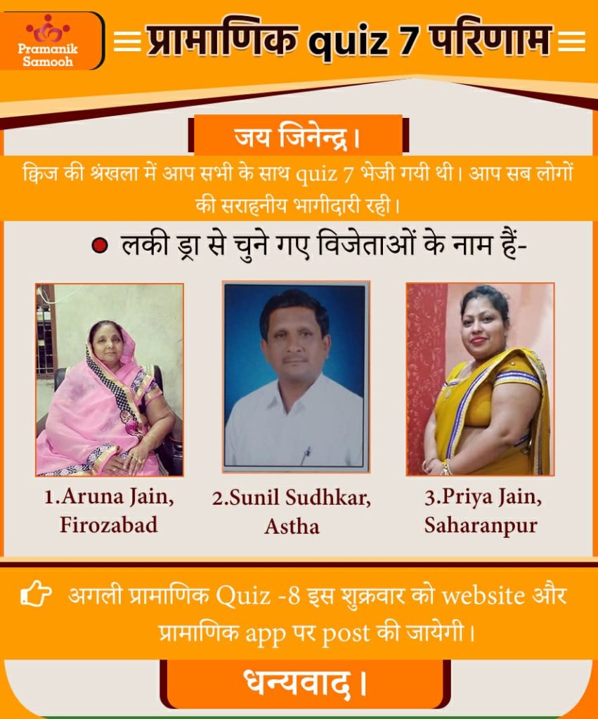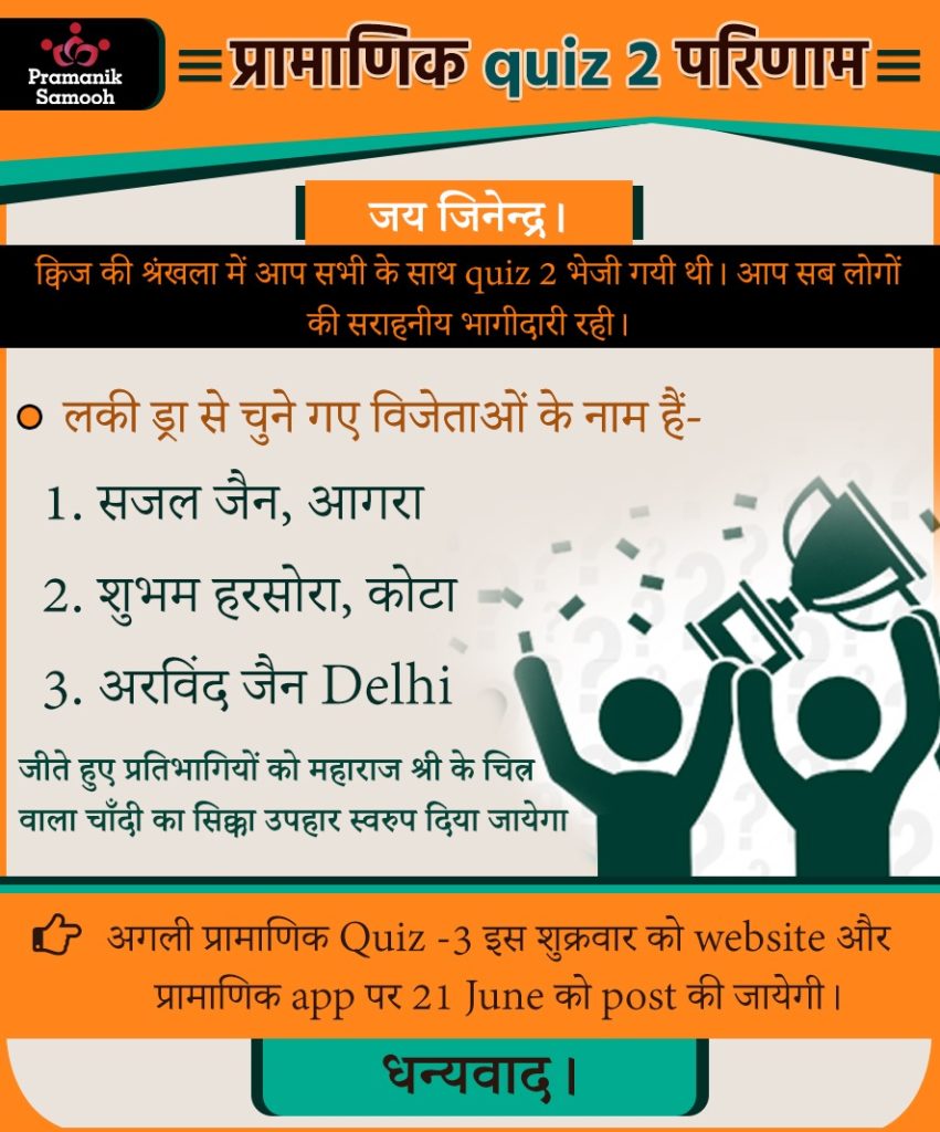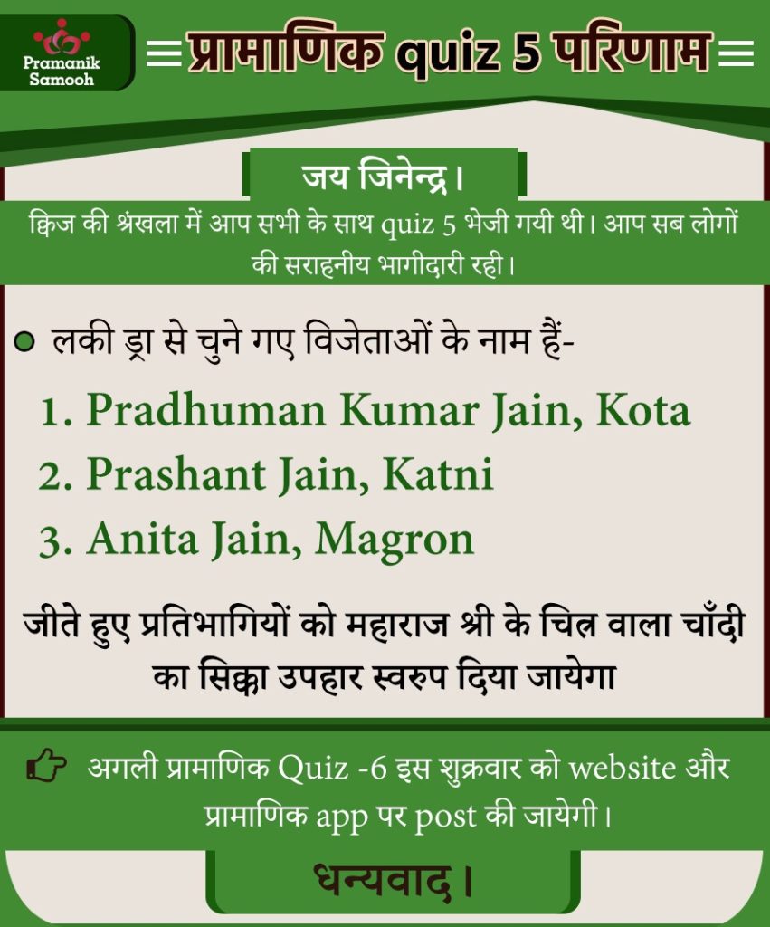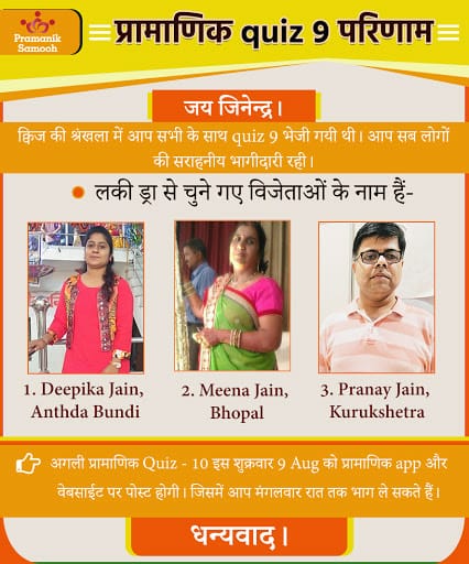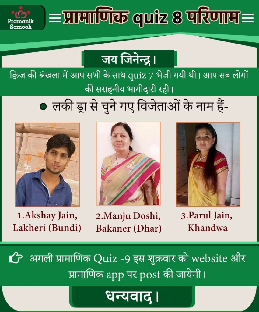 Q1. मुनि श्री 108 प्रमाण सागर जी महाराज स्वयं को जैन धर्म का एक ……………. मानते हैं। Answer: विद्यार्थी Q2. धर्मी व्यक्ति का goal जीवन का ……… होगा। Answer: कल्याण Q3. विद्या प्रमाण का गुणनफल क्या हैं? Answer: गुणायतन
