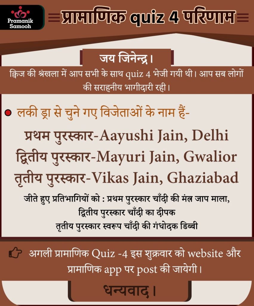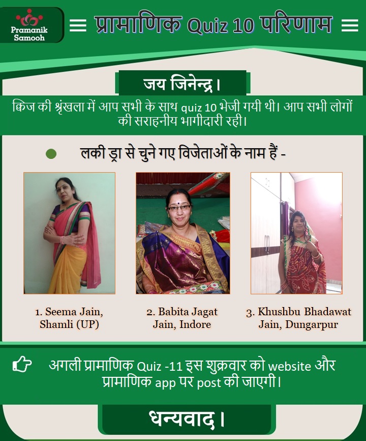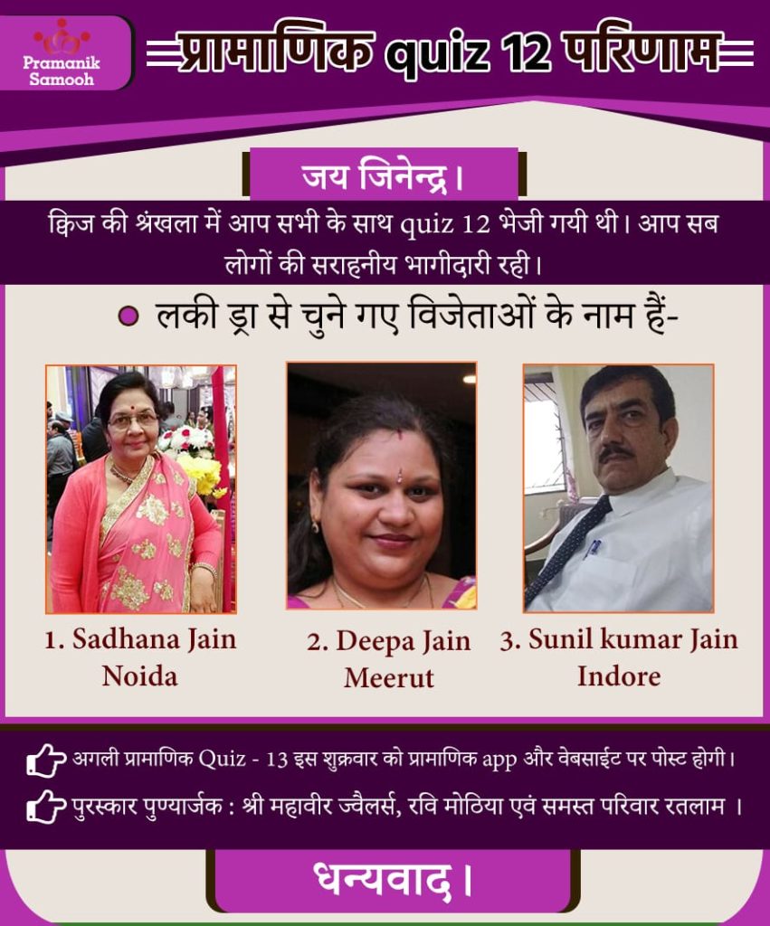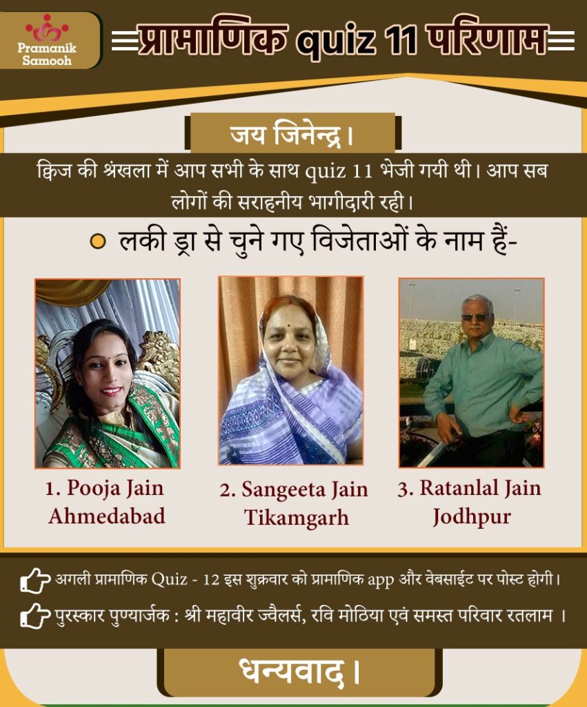 Q1. मुनि श्री 108 प्रमाण सागर जी महाराज स्वयं को जैन धर्म का एक ……………. मानते हैं। Answer: विद्यार्थी Q2. धर्मी व्यक्ति का goal जीवन का ……… होगा। Answer: कल्याण Q3. विद्या प्रमाण का गुणनफल क्या हैं? Answer: गुणायतन