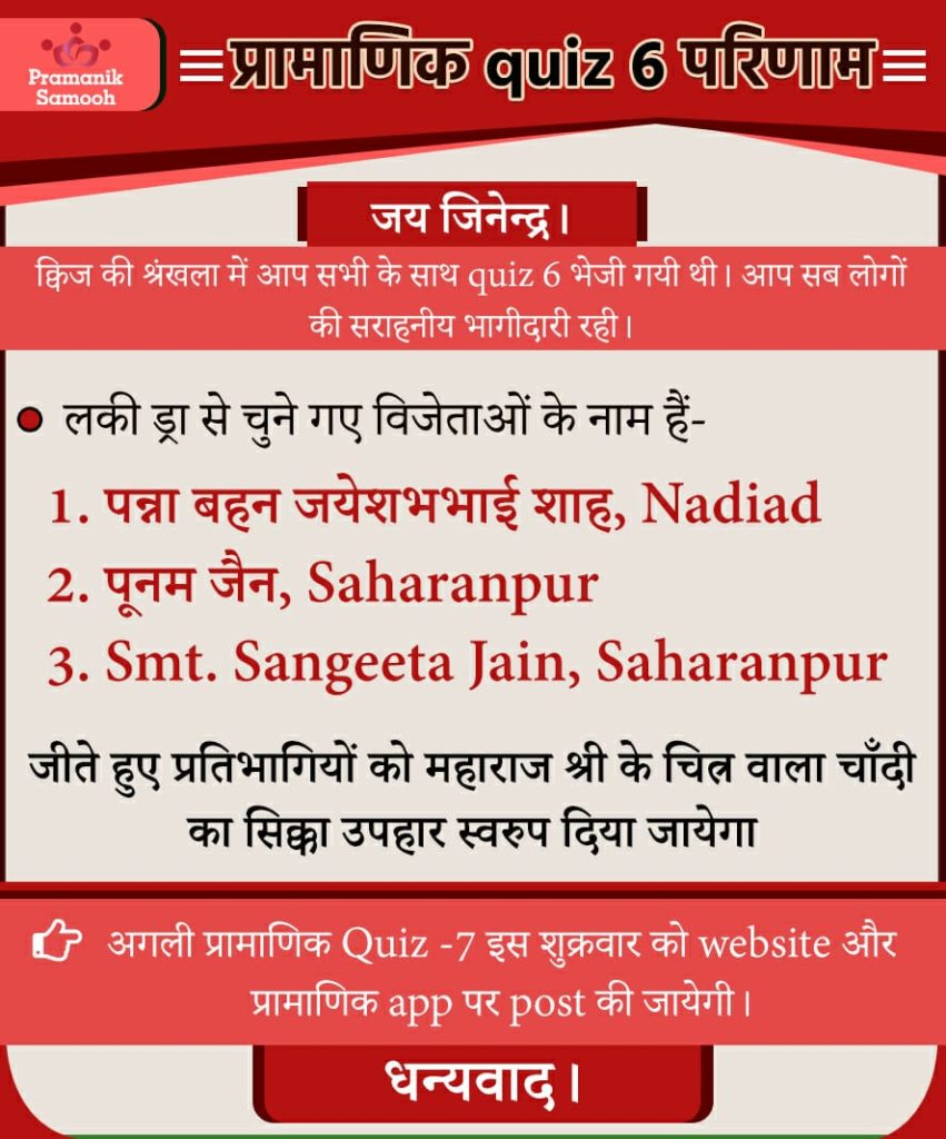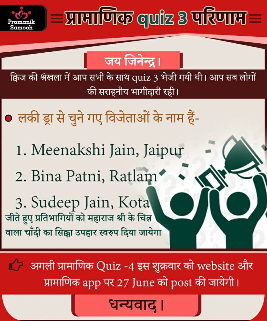 Q1. हे वीतराग ………….ज्ञानी, श्री मुनिवर को मेरा प्रणाम। Answer: आगम Q2. हमारे आदर्श का दूसरा गुण क्या होना चाहिए? Answer: वीतरागी Q3. जीवन में समरसता एक दूसरे के प्रति ......... से ही लायी जा सकती हैं। Answer: आदर भाव